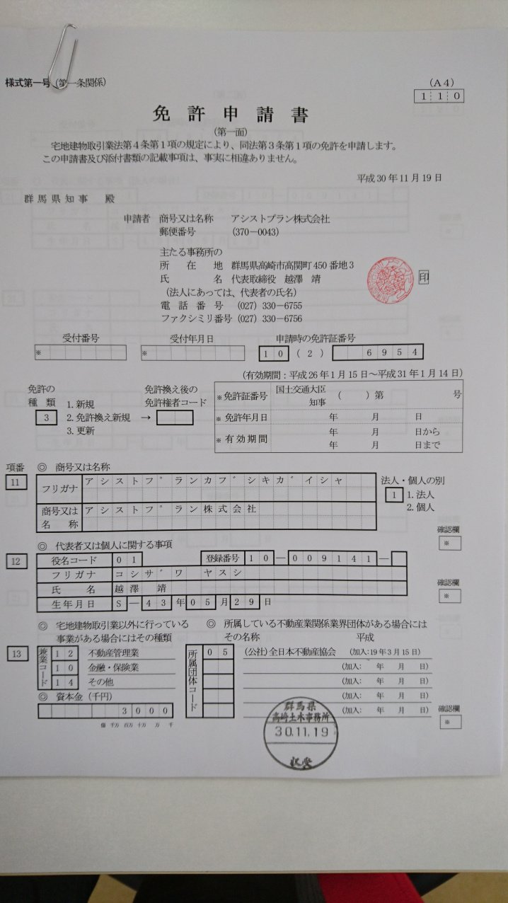 高崎の不動産情報 > アシストプラン株式会社のブログ記事一覧 > 不動産業の免許更新提出してきました!